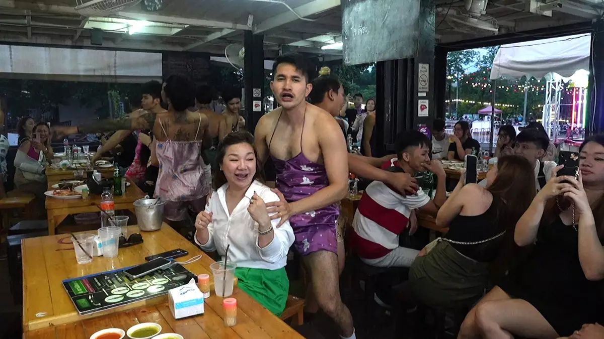 《冲遊泰國》今晚(11月20日)胡慧冲帶住冬蔭表妹同表哥再度出動,重點推介Staneemeehoi海鮮餐廳,胡慧冲還特意變裝扮成大隻佬,配合現場氣氛。海鮮餐廳賣點是每晚的兩場表演,穿上女性睡衣的工作人員,會隨住音樂響起,個個又跳又叫,跟食客打成一片,不分男女捉住食客邊搖邊嗌「Out Out」,氣氛相當熱鬧,而餐廳亦因此有Out Out餐廳稱號。
