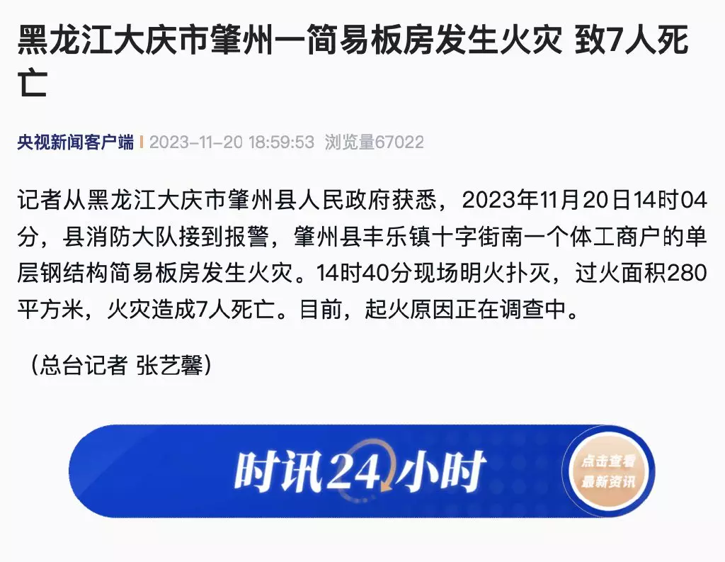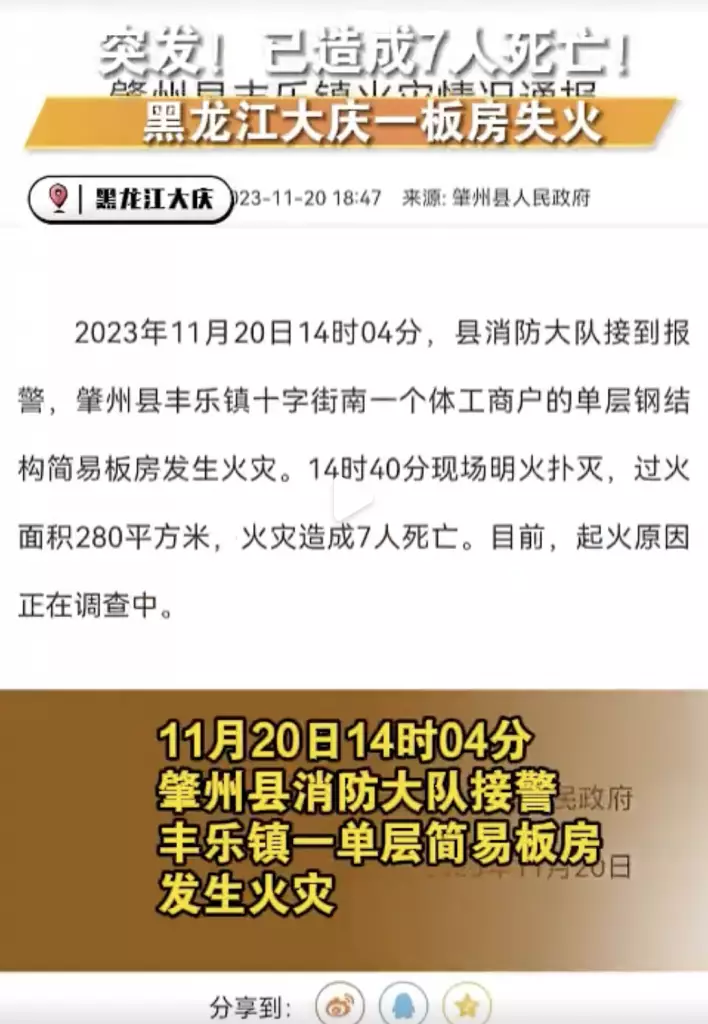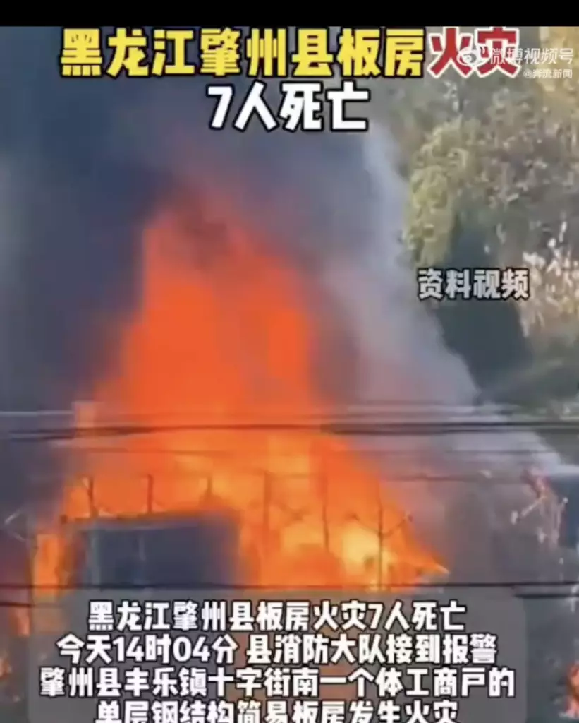黑龍江大慶市有簡易板房起火,造成7人死亡。