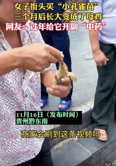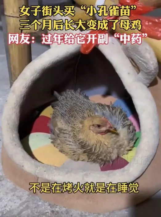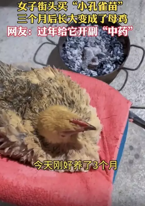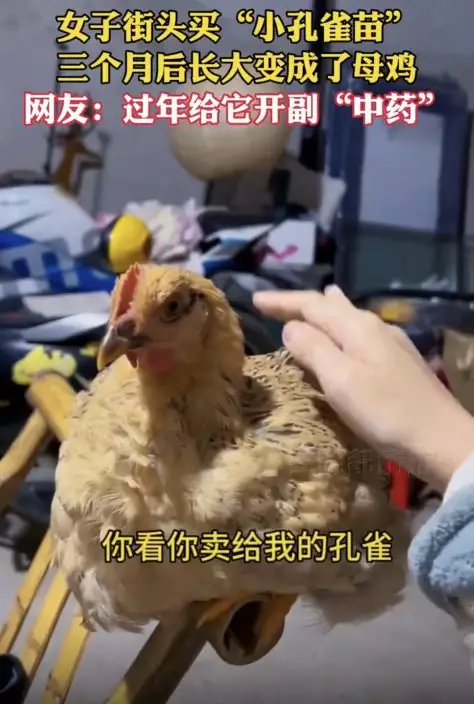 內地女在街頭買買了孔雀幼崽,經過3個月精心飼養後發現其實是母雞,網民揶揄:可以煲湯!