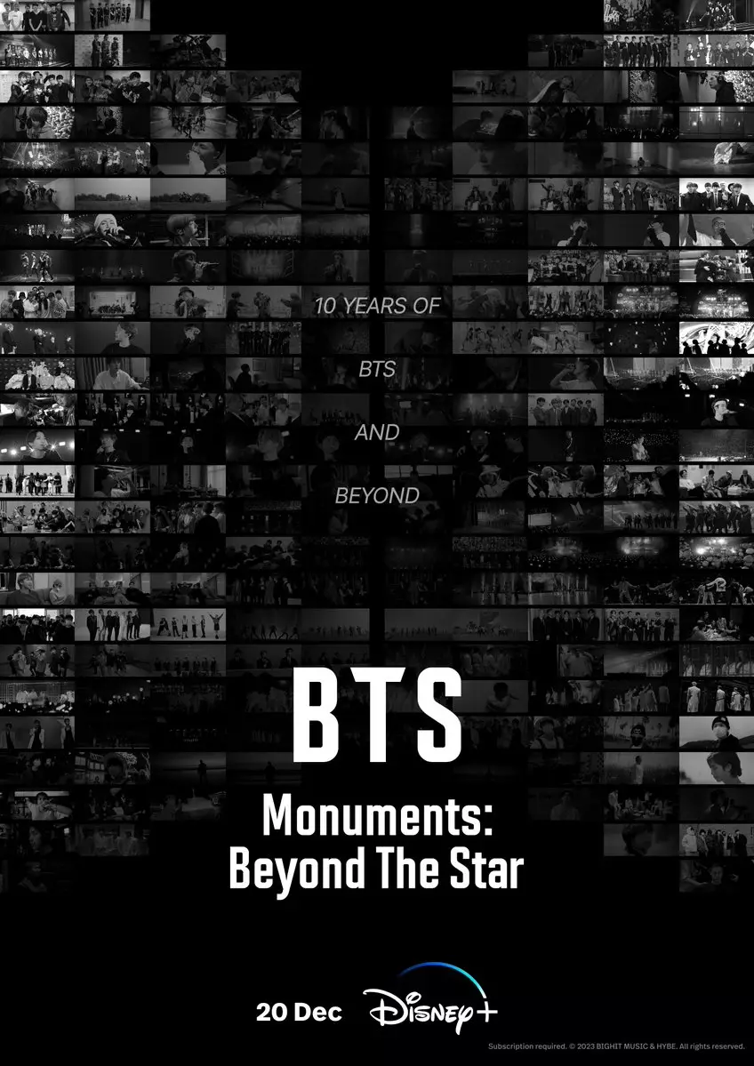 繼2022年推出音樂會現場錄像《BTS防彈少年團 : PERMISSION TO DANCE ON STAGE- 洛杉磯》後,即將於12月20 日獨家在Disney+,一口氣上線首兩集BTS最新原創紀錄片《BTS Monuments: Beyond The Star》,其後每逢周三發布全新兩集內容,一共8集。