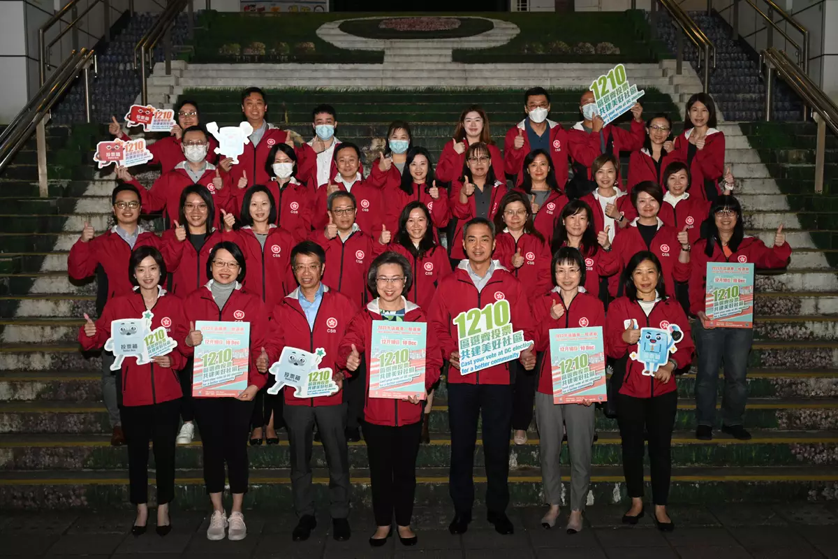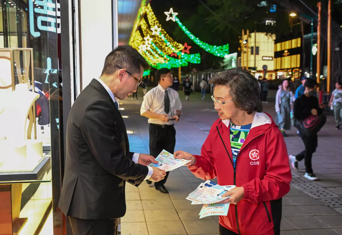 公務員事務局義工隊晚上到尖沙咀,向商鋪店員和市民,並派發宣傳單張,呼籲選民在下月10日投票選出為社區服務的區議員。