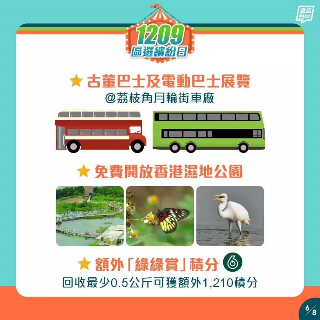 濕地公園、科學館和太空館及香港藝術館的收費展覽會免費開放;亦會提供多項參觀歷史建築及古蹟的優惠。環境及生態局聯同九巴,在荔枝角月輪街車廠展覽古董巴士及電動巴士,免費參觀。當日市民到「綠在區區」社區回收網絡進行回收,回收最少0.5公斤回收物可獲額外1210「綠綠賞」積分。