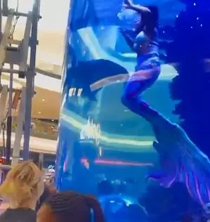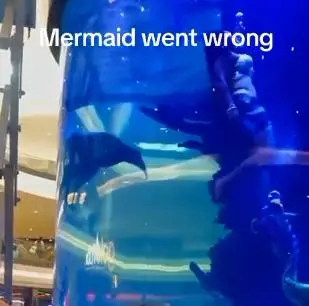 A terrifying moment unfolded in front of concerned shoppers when a professional mermaid's tail got caught on the reef at the bottom of a mall's aquarium tank.