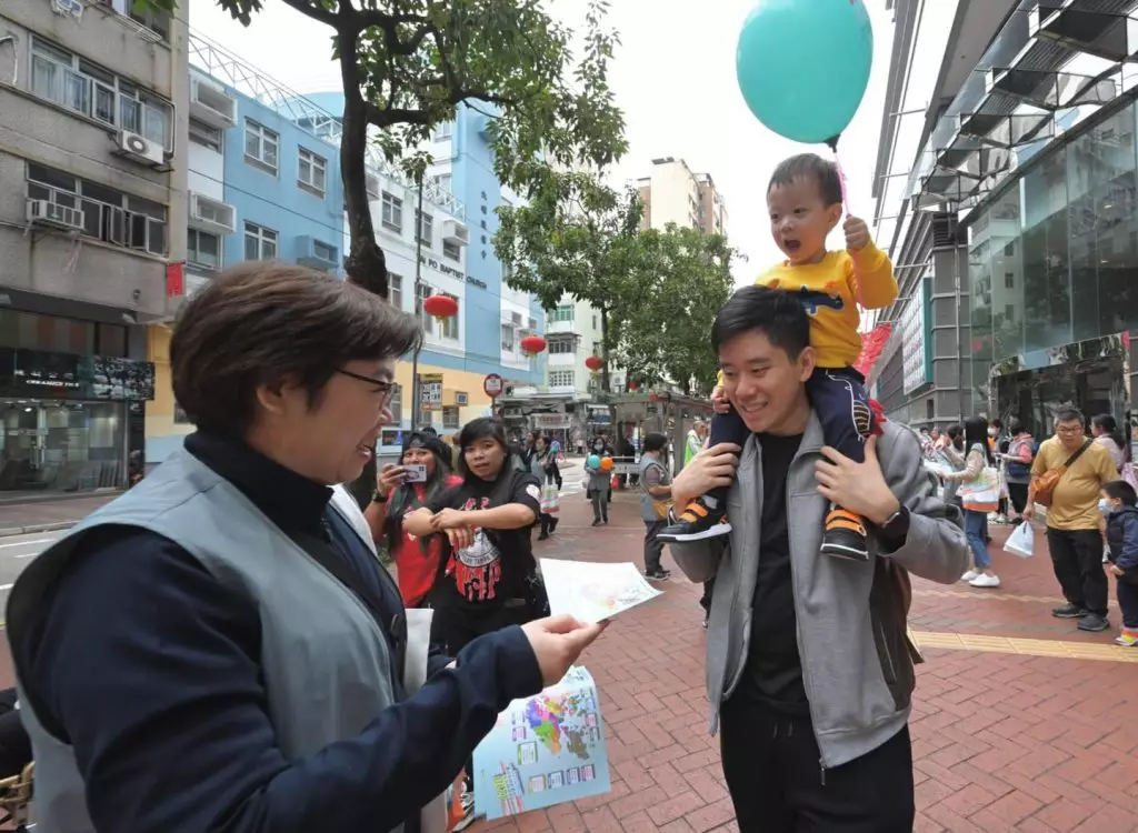 常任秘書長傅小慧和副局長胡健民一同落區,特別提醒市民區議會地方選區選舉採用「雙議席單票制」,即每名選民投選所屬選區的1名候選人,每個選區得票最多的2名候選人當選。