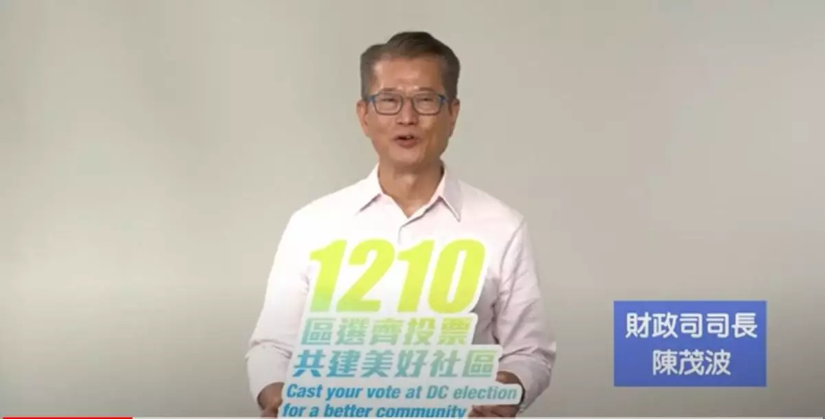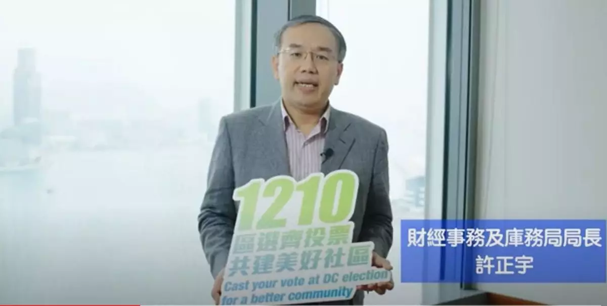 財政司司長陳茂波、財經事務及庫務局局長許正宇、積金局主席劉麥嘉軒、香港金融發展局主席李律仁,一齊為「1210 區議會選舉」拍攝宣傳短片,他們齊齊表示要推動更舒適社區的建設,支持更關愛社區的發展,是由選民的一票開始,呼籲大家12月10日區議會選舉記得去投票!