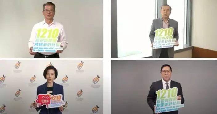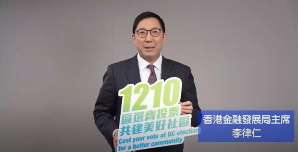 財政司司長陳茂波、財經事務及庫務局局長許正宇、積金局主席劉麥嘉軒、香港金融發展局主席李律仁拍片,呼籲大家12月10日記得去投票。
