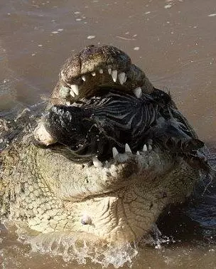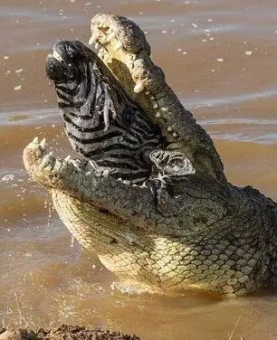 攝影師斯里達蘭(Subramanian Sridharan)到肯尼亞馬賽馬拉國家保護區(Maasai Mara National Reserve)拍攝時,意外目擊到一條巨鱷在水裡進食,仔細一看,鱷魚的血盆大口中竟然冒出一個斑馬的頭顱,像是對外求救,乍看之下就好像是將整隻斑馬都吞下肚。