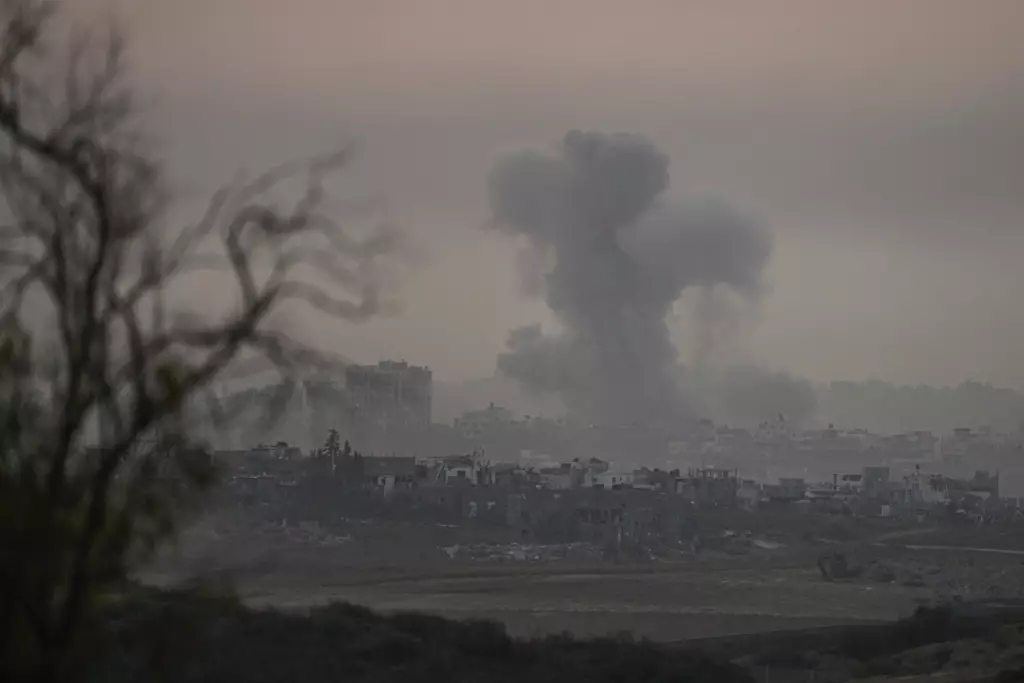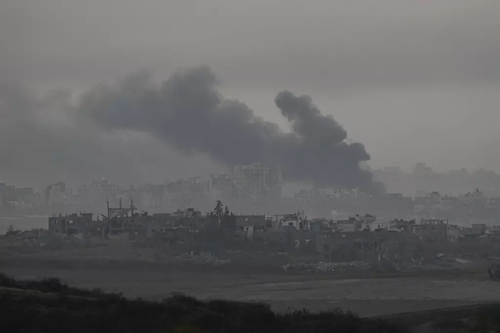 汗尤尼斯市區升起濃煙並傳出劇烈爆炸聲。(AP圖片)