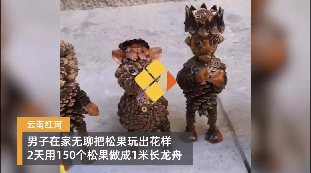 除了一些花瓶之外的作品,男子近期更用松果創作了《西遊記》中的經典師徒形象,以及十二生肖的各個角色。這些作品不僅展示了李先生的創造力,也體現了他對傳統文化的熱愛和尊重。其中最引人注目的作品是一艘由150個松果拼湊而成且長達1米的龍舟,期間花費了將近20個小時的時間,十分精緻。