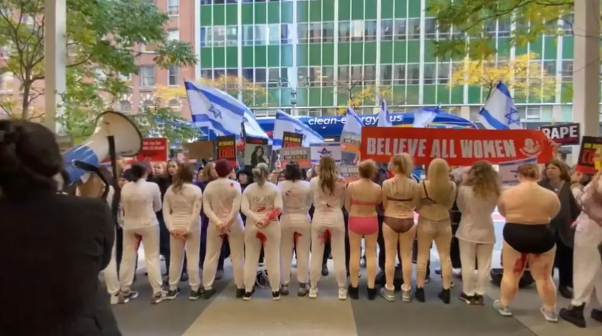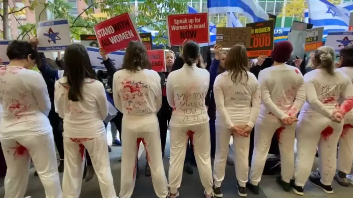 一批猶太婦女及她們的支持者在聯合國總部外遊行,抗議聯合國對哈馬斯武裝分子殘暴對待以色列婦女未有採取任何行動。