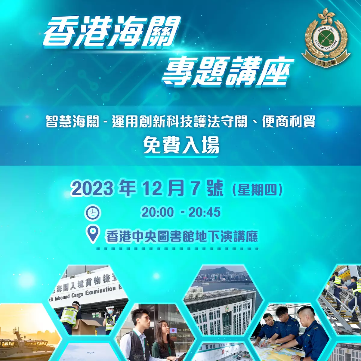 香港海關推行「智慧海關藍圖」,透過應用創新科技,進一步提升海關的職能。香港海關將於12月7號(星期四)晚上在香港中央圖書館嘅演講廳舉行「智慧海關 - 運用創新科技護法守關、便商利貿」專題講座。免費入場。