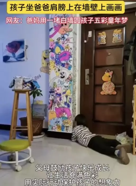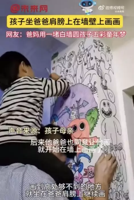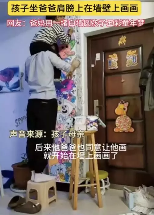 爸爸讓6歲兒子坐自己肩上在家裡牆壁上畫畫,有愛互動引網民讚揚:家庭氛圍很棒!