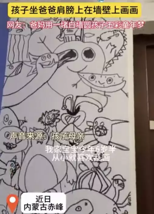日前,內蒙古赤峰市一名6歲小朋友和爸爸的有愛互動引來網民稱贊連連!影片中一名男童拿著畫筆在家中的一面白牆上進行繪畫創作,僅用3天的時間便創作出了一幅五彩繽紛的壁畫。畫到高處夠不到的地方爸爸就讓其坐在肩膀上繼續作畫。