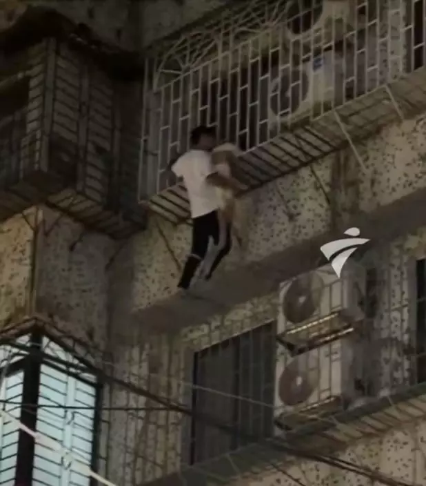男童頭卡4樓防盜窗縫隙,熱心男子爬牆托舉助脫險。影片截圖