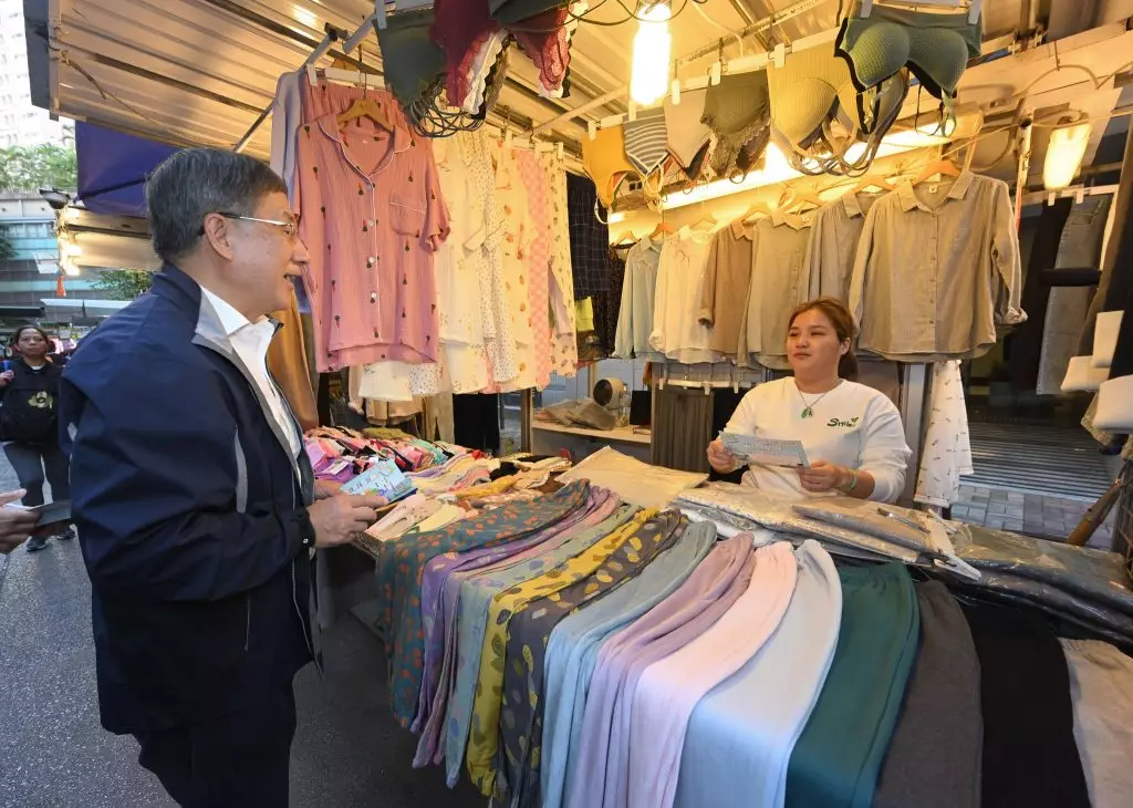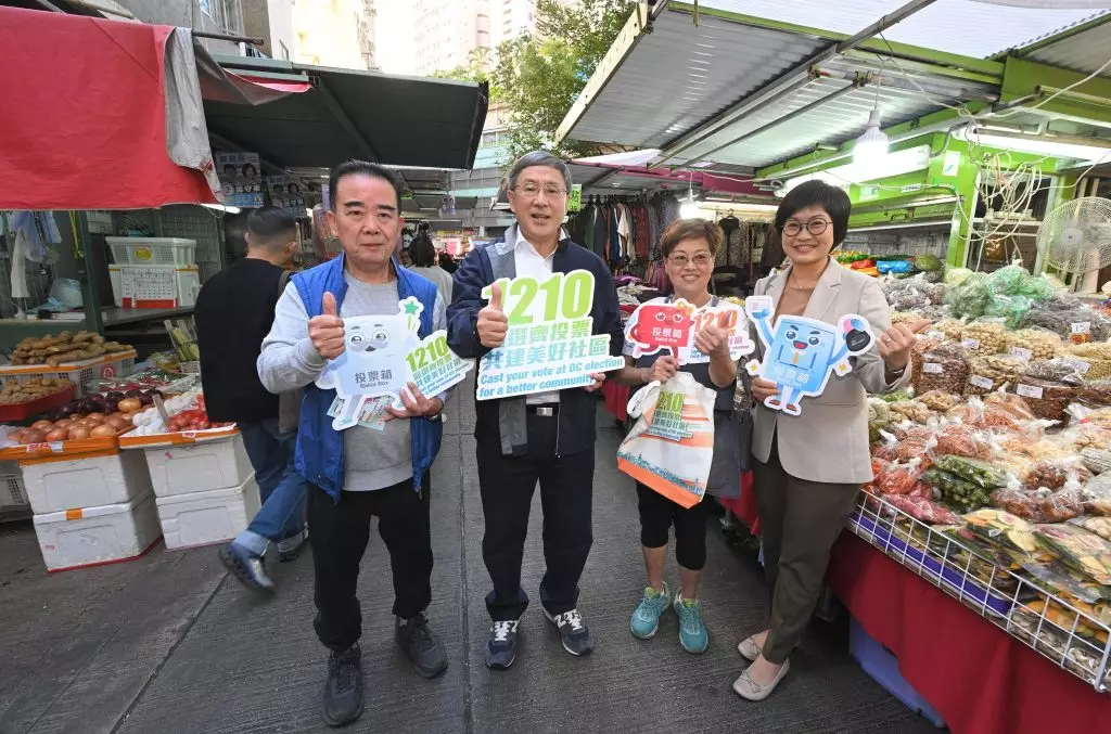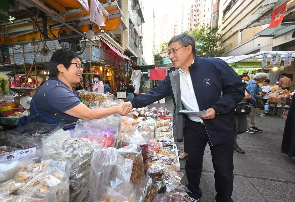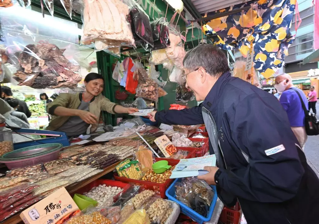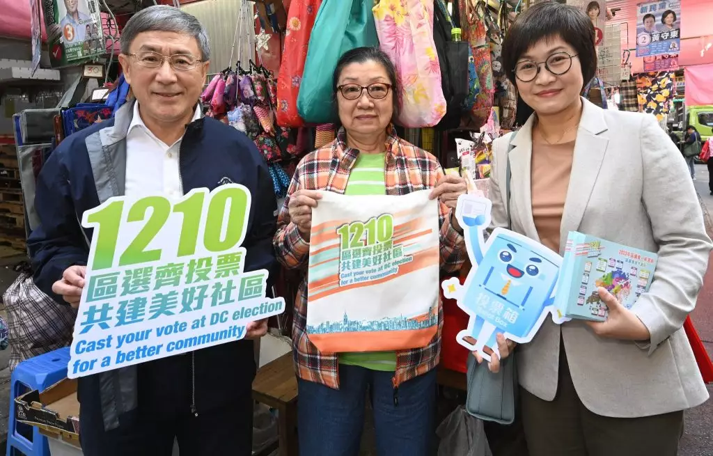 區議會選舉星期日舉行,政務司副司長卓永興與行政署長伍江美妮,到灣仔交加街一帶的露天街市,向販商及市民派發區選宣傳單張及紀念品。