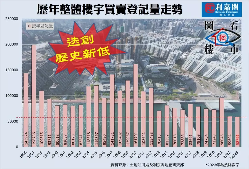 配合二手住宅登記緩緩上升、工商舖及其他物業繼續向好,預期十二月份整體樓宇買賣登記量有力再下一城,進一步升破四千宗之上水平,料挑戰4,500宗,按月再漲27%,冀明年整體樓宇買賣登記量可繼續遠離谷底,徐徐回升。不過,預測2023年全年,整體樓宇買賣登記宗數料僅得58,791宗,將較2022年的59,694宗微跌1.5%,有機會連續兩年迭創1996年有史以來新低。