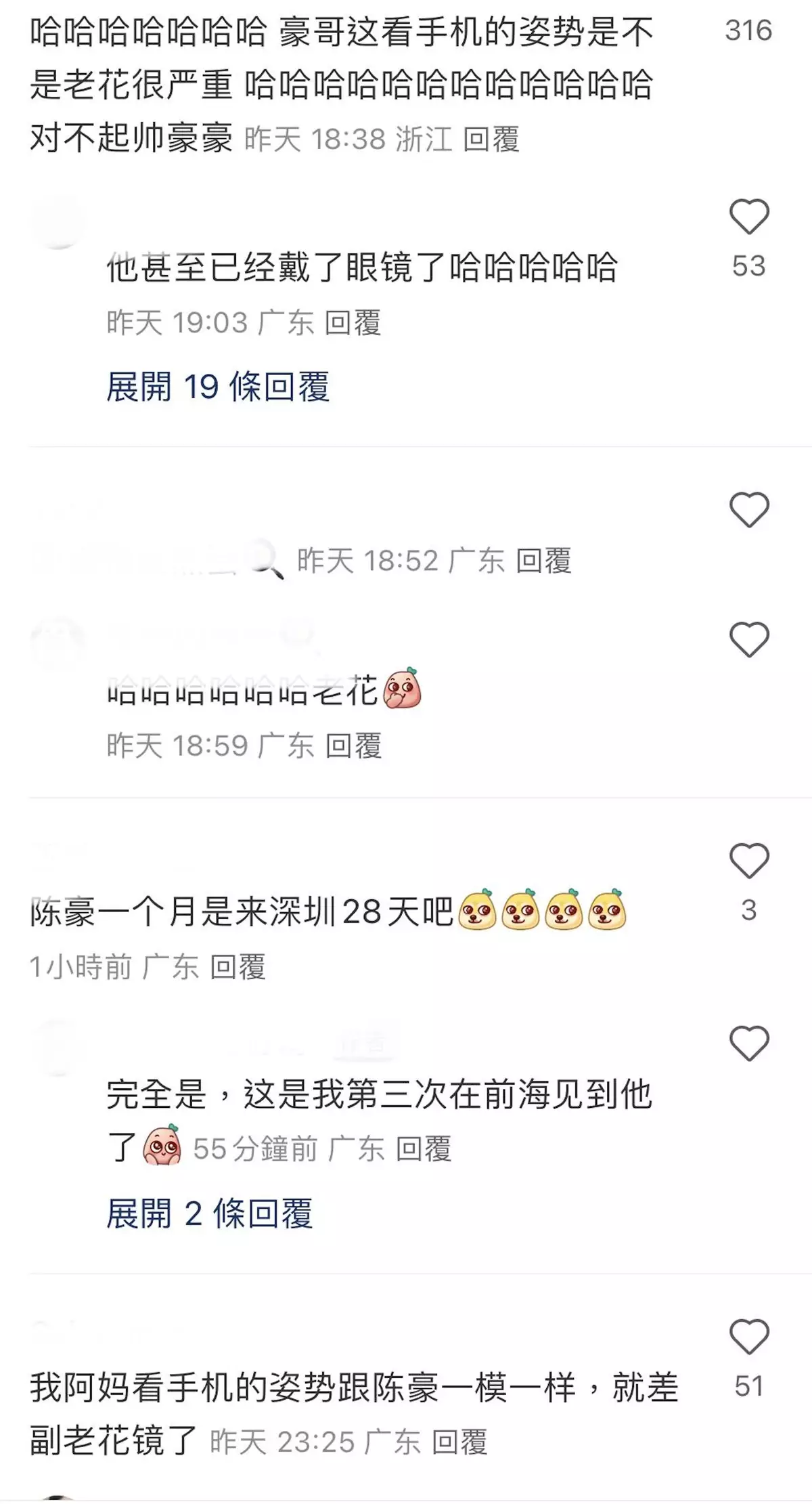 網友留言笑指:「這看手機的姿勢是不是老花很嚴重,對不起帥豪豪」、「年紀大了都這樣呀 明星也是普通人,也會老花」、「哈哈哈哈哈哈哈 豪哥這看手機的姿勢是不是老花很嚴重 哈哈哈哈哈哈哈哈哈哈哈哈 對不起帥豪豪」、「他甚至已經戴了眼鏡了哈哈哈哈哈」、「陳豪看手機的姿勢和我爸一模一樣哈哈哈哈哈哈,他是不是老花了哈哈哈哈」、「老人家睇手機哈哈哈哈哈哈哈」、。
