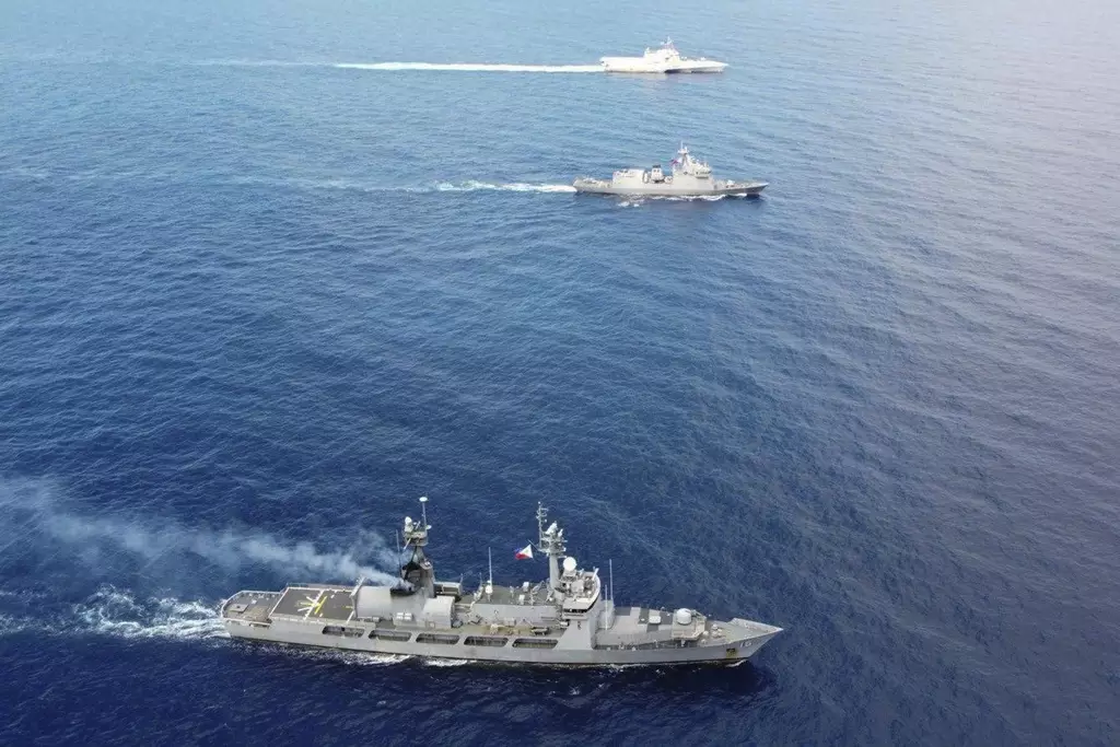 菲律賓軍艦拉蒙·阿爾卡拉斯號在南海放出小艇。AP資料圖片