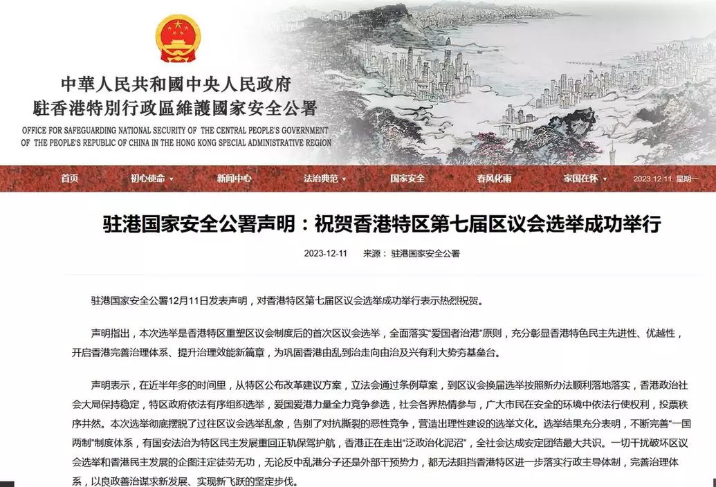 駐港國家安全公署發表聲明,對區議會選舉成功舉行表示熱烈祝賀。