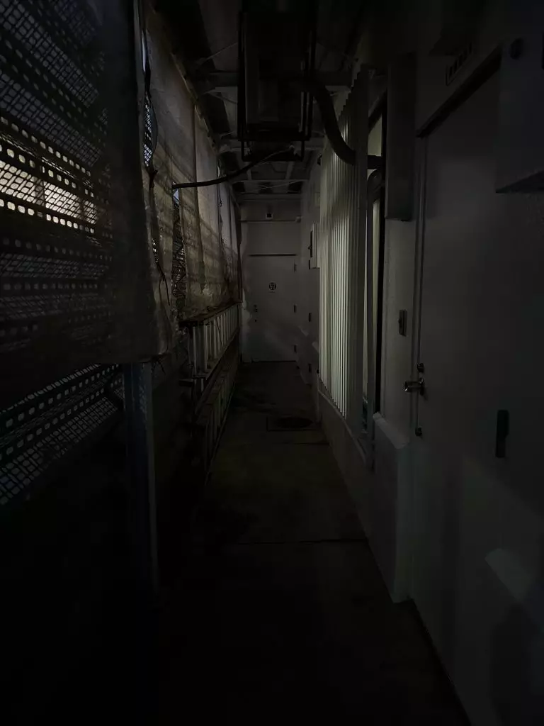 圖片中可見,此處毫無燈光,只有幾絲由外面透入的微光讓這個極黑環境不至於陷入死寂,加上看似沒有盡頭的長長走廊,膽子小的人根本不敢靠近。然而在走廊盡頭的門上,卻寫著「入口在此」,如同置身鬼屋現場。
