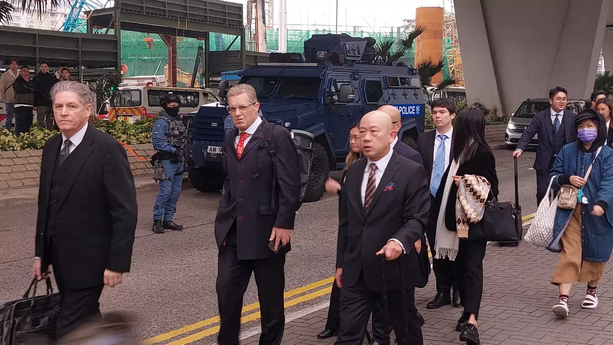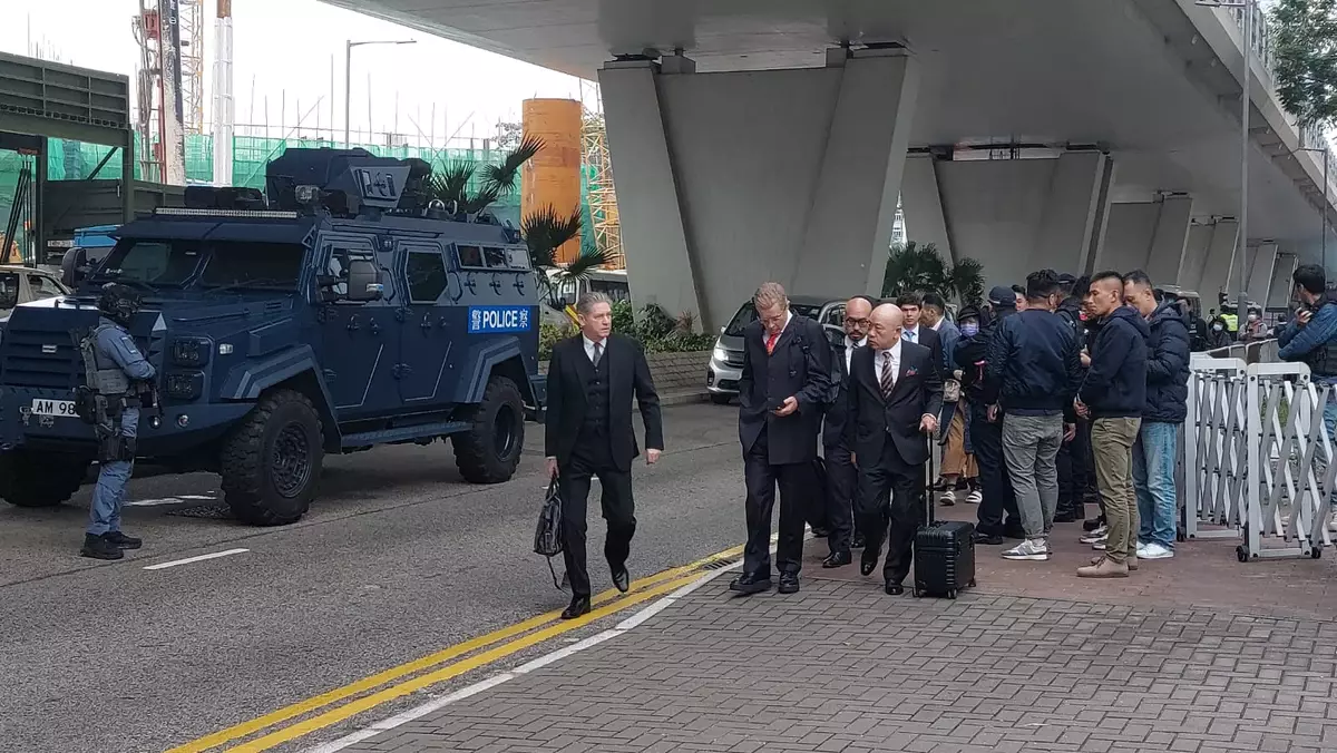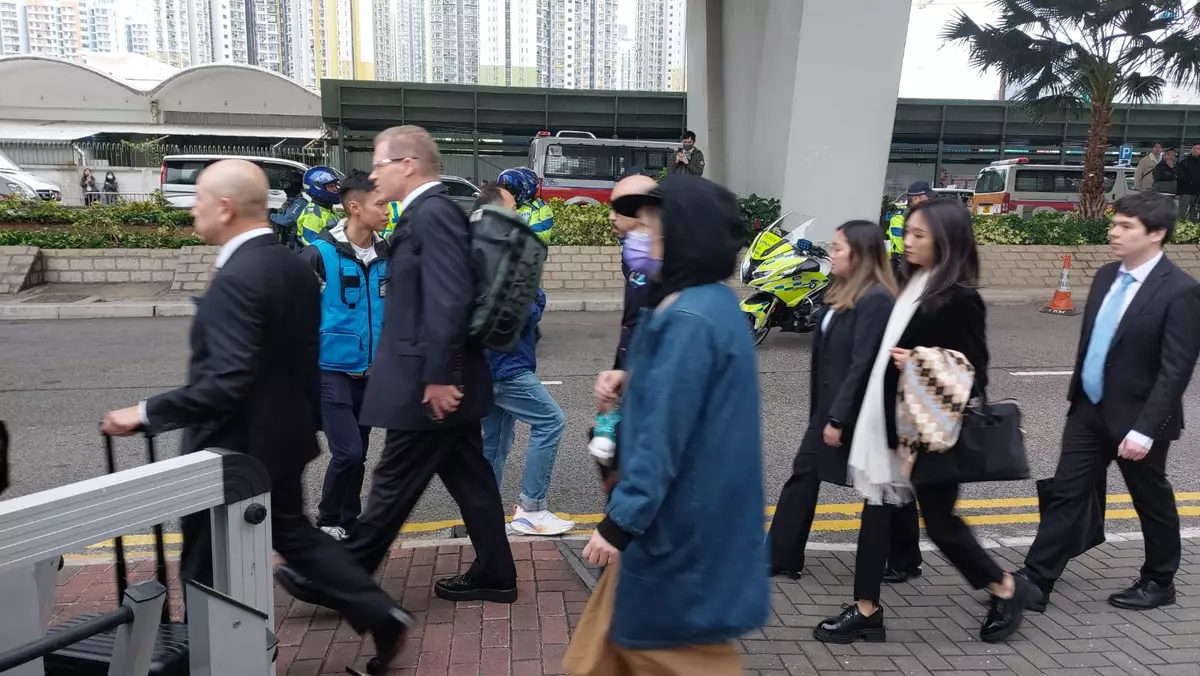 黎智英被帶離場時,一位律師與其談話,隨後該名律師再走向黎智英太太,兩人握手寒暄。