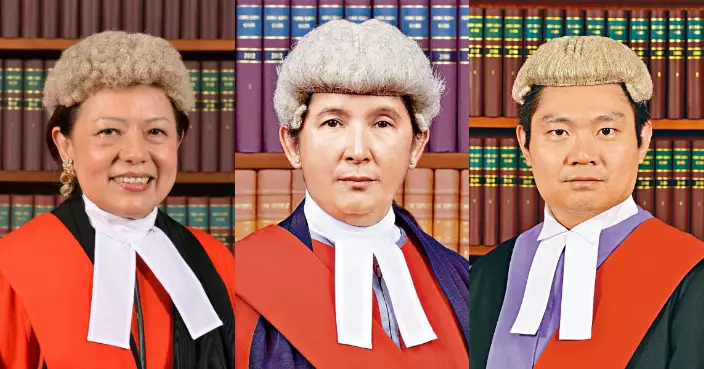 本案不設陪審團,由三名高等法院國安法指定法官杜麗冰(左)、李素蘭(中)及李運騰(右)審理。