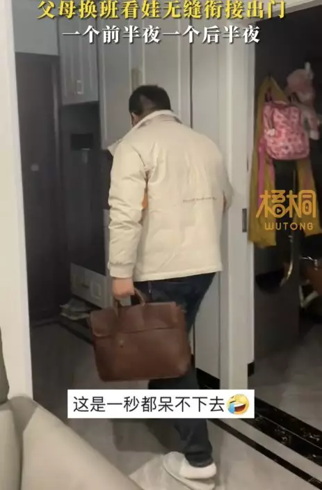 據悉,2人商量丈夫負責晚上前半段的育兒任務,而妻子則在半夜十二點後接手。這樣的安排使得每個人都有機會在晚上享受一段屬於自己的時間。而妻子半夜12點回家後,丈夫連忙帶上手袋和茶杯,面帶笑容表示「下班」,然後頭也不回出門,這一畫面令妻子爆笑不已!