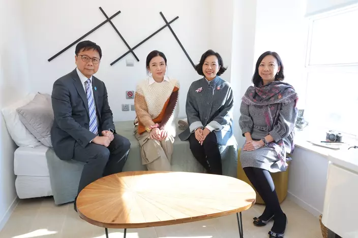 (由左至右)民政及青年事務局青年專員陳瑞緯、華人置業集團行政總裁劉陳凱韻、民政及青年事務局局長麥美娟及民政及青年事務局常任秘書長林雪麗一同「仲學舍」青年宿舍單位