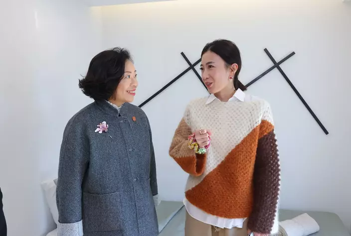 民政及青年事務局局長麥美娟及華人置業集團行政總裁劉陳凱韻互相交流意見