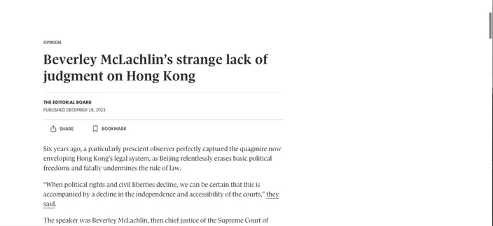 黎智英案周一(12月18 日)開審後,西方政客和媒體大張撻伐,借機攻擊香港司法制度。加拿大媒體《環球郵報》發表社論文章,指香港司法制度已經敗壞,要求來自加拿大的香港終審法院非常任法官麥嘉琳(Beverley McLachlin),辭去終院非常任法官一職。
