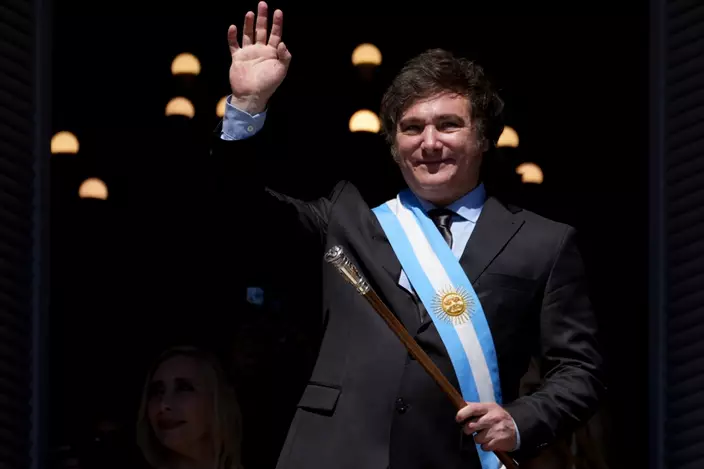 當地時間12月10日,米萊在布宜諾斯艾利斯議會大厦宣誓就職,並向支持者發表講話。AP圖片