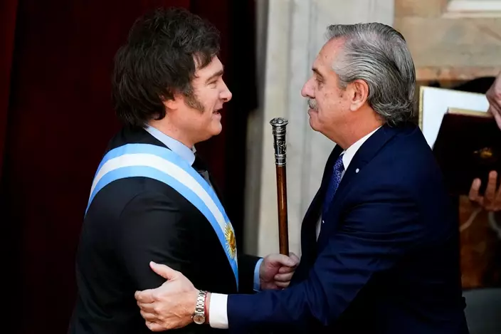 當地時間12月10日,米萊從費爾南德斯手中接過總統手杖。AP圖片