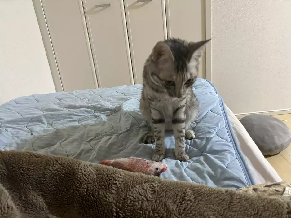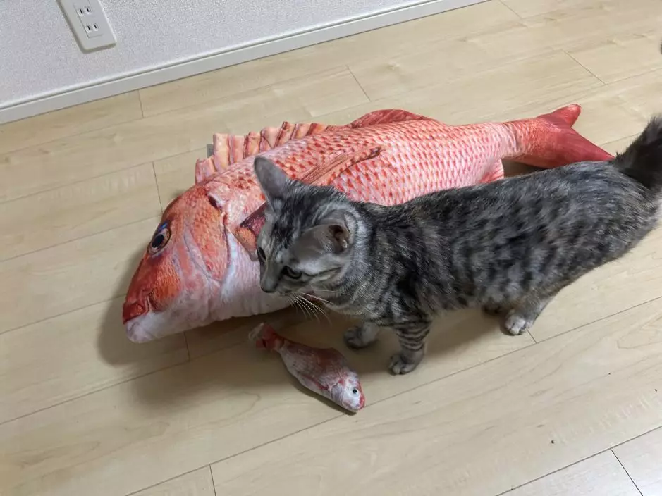 近期,他購買了一個巨大且全身紅彤彤的鯛魚公仔兼抱枕,原意是要讓精力充沛的Setsuna自己去玩,以換取安逸的清晨。然而,當Setsuna面對這個比自己還大的玩偶時,反而有些驚慌失措,不敢靠近。這一幕使得飼主忍不住吐槽,「怎麼了?欸你倒是給我玩啊!」