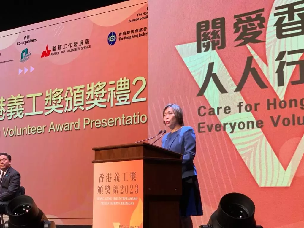 香港賽馬會董事龔楊恩慈表示,香港賽馬會多年來支持不同義工項目,推動義工服務發展,包括於2023年主導開展「賽馬會眾心行善」計劃,為社會大眾提供多元化的義工服務,並透過此計劃支持「香港義工獎」增設六個新獎項。她恭賀所有得獎者,又指他們的無私奉獻為大眾樹立榜樣。