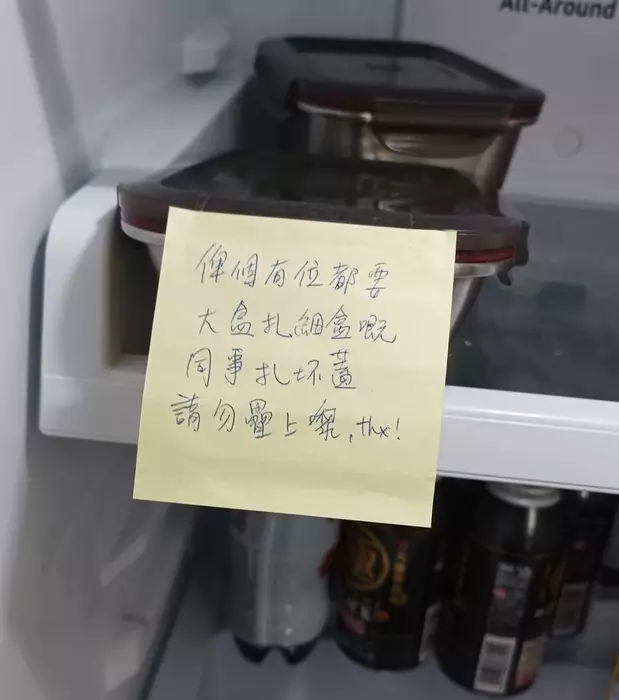其後,打工仔又再次發文,表示打開雪櫃又見到該同事留下的Memo「俾個有位都要大盒扎細盒嘅同事扎壞蓋。請勿疊上嚟,thx!」樓主認為同事非難頂兼麻煩「駛唔駛咁串呀?今天又長篇大論,平時都係得幾個人帶飯。疊你幾次,個蓋就壞」,更重申「佢寫完紙仔之後,已經冇人疊佢個飯盒啦」。