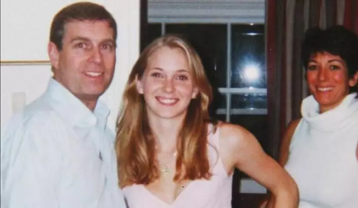 安德魯王子(左)曾在美國被女子尤弗裏(中)起訴性侵,最後雙方庭外和解。此照片攝於2001年。