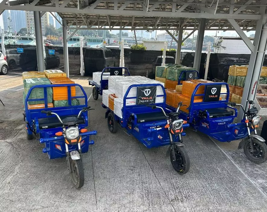 海關周三(10日)傍晚在大澳部署,發現幾架可疑電動三輪車駛近岸邊位置,另有幾名男子在附近徘徊,其後2艘快艇駛至,男子隨即把貨物搬上快艇。海關人員馬上採取行動,歹徒見事敗即跳上快艇,往內地水域方向駛去,而幾名電動三輪車司機亦棄車逃遁。