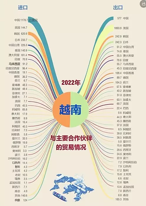 在美國從越南大量進口商品時,越南卻在大量從中國進口原材料,零部件。2022年,越南對美國出口為1094億美元,而從中國進口1179億美元,中國是越南第一大進口國。