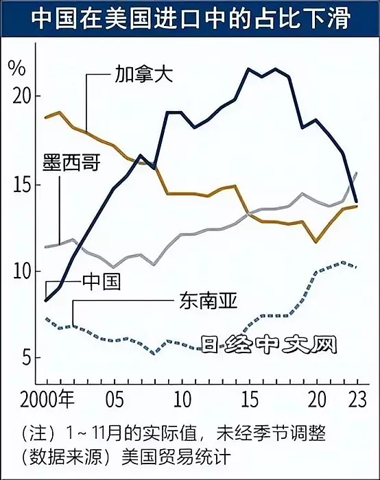 美國商務部公佈數據,2023年美國對華進口同比減少近20%,中國不再是第一大進口國,打破了維持17年的紀錄。日本媒體也大肆報道。