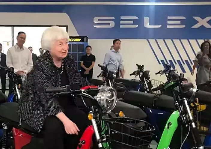 美國財政部長耶倫去年訪問越南時,坐在一輛電單車拍照。