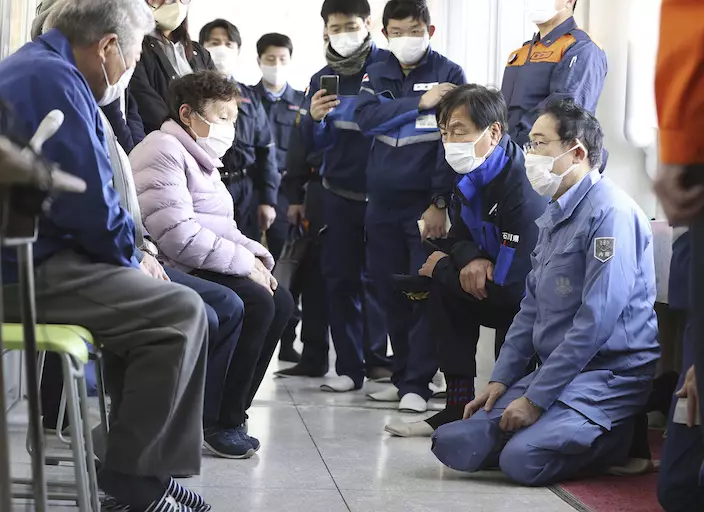 日本首相岸水文雄(右)日前到訪災區,和災民交談。 AP圖片