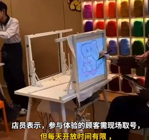 圖片中可見,這個區域看起來十分專業,貨架上有整墻不同顏色的毛線供客人選擇,客人先在電腦上隨意畫出想要的草稿,之後就可以根據自己的喜好選擇毛線顏色,並透過使用簇絨槍做出各種小物,如小毯等。