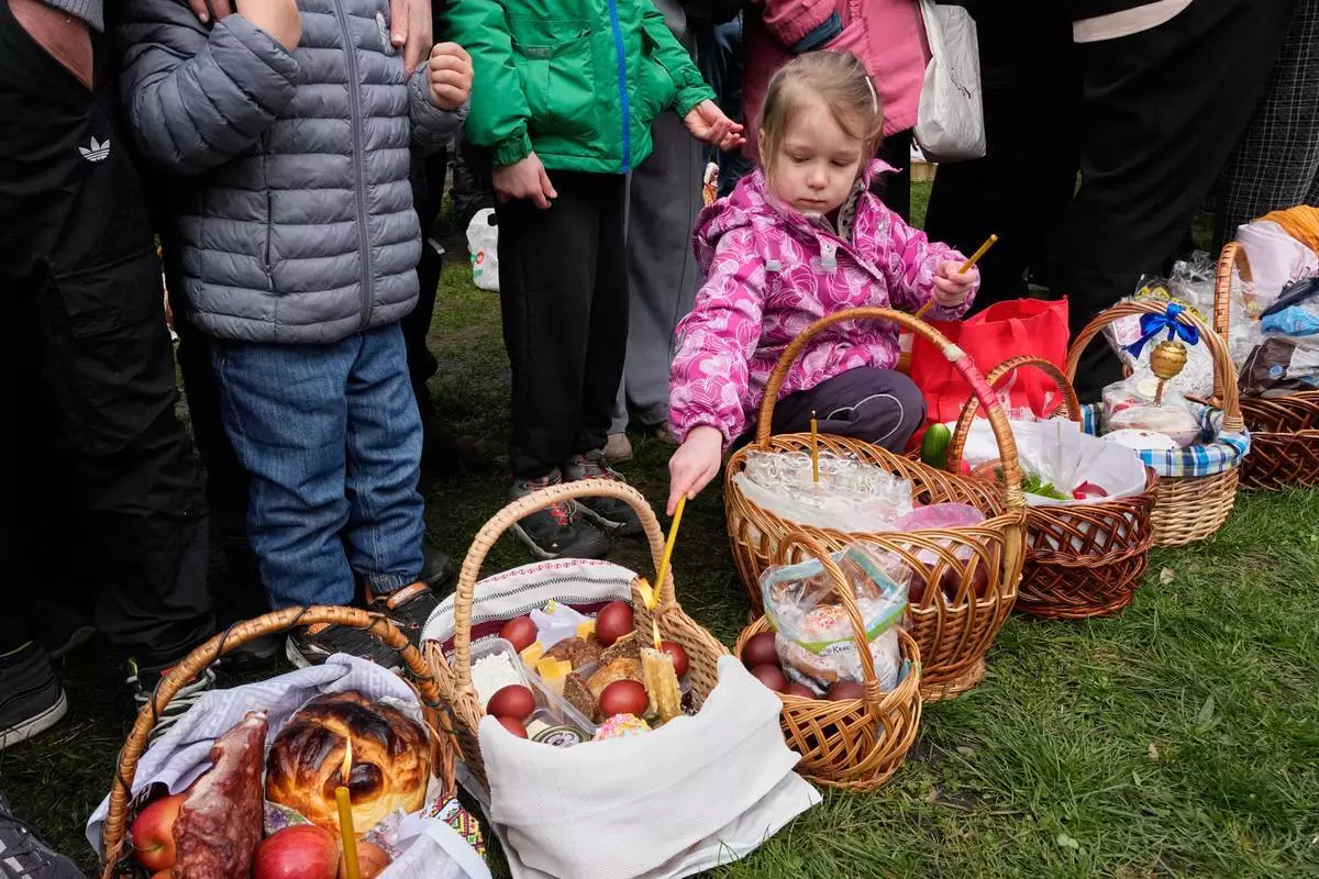 一名小女孩點燃蠟燭,民眾在烏克蘭基輔附近的皮羅希夫,為復活節籃子祈福,慶祝東正教復活節。攝於2026年4月12日周日。(美聯社圖片/Efrem Lukatsky) AP圖片