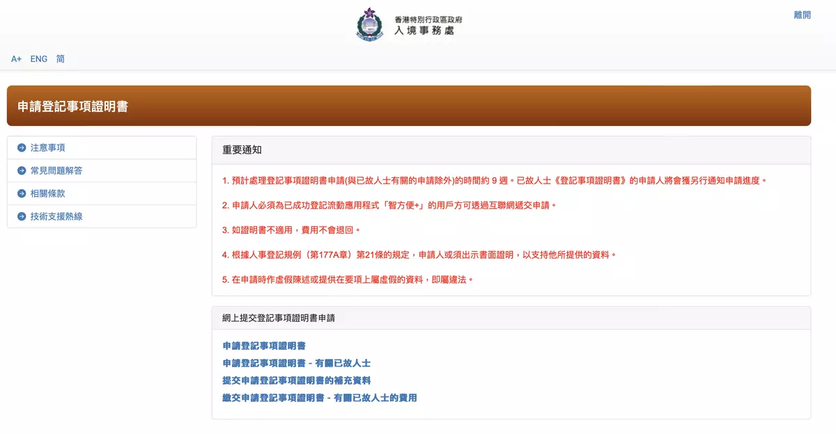 入境處推出網上申請《登記事項證明書》的電子服務,即日起申請人可在網上申請《登記事項證明書》,並可選擇經郵遞方式收取有關證書,毋須親身前往人事登記辦事處。