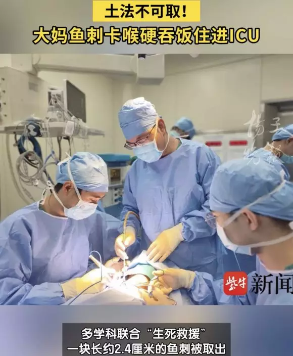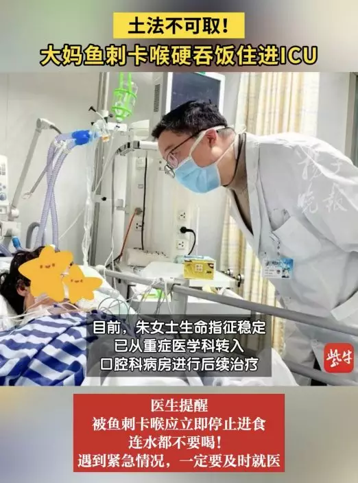 近日,江蘇揚中發生一起醫療緊急事件,一名62歲朱女士在家中因被魚刺卡喉後試圖吞飯團將魚刺推下,結果反弄巧成拙,導致情況惡化,最終不得不住進重症監護室(ICU)接受治療。