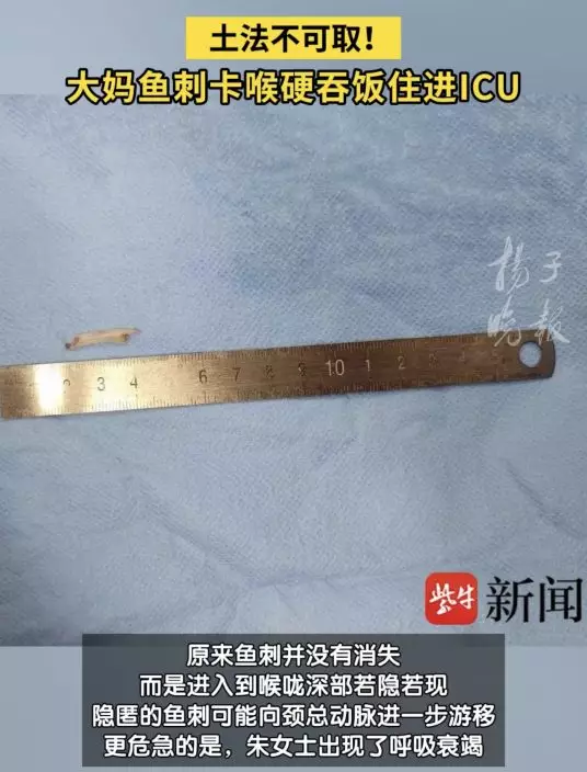 在上級醫院,醫生發現魚刺並未消失,而是深入喉部若隱若現,其隱匿的魚刺可能進一步移動至頸總動脈,並造成更大的危險。更危急的是朱女士還出現了呼吸衰竭的情況。經過多學科團隊的聯合緊急救援,一塊長約2.4釐米的魚刺被成功取出。目前,朱女士的生命體徵已經穩定,並轉入口腔科後續治療。