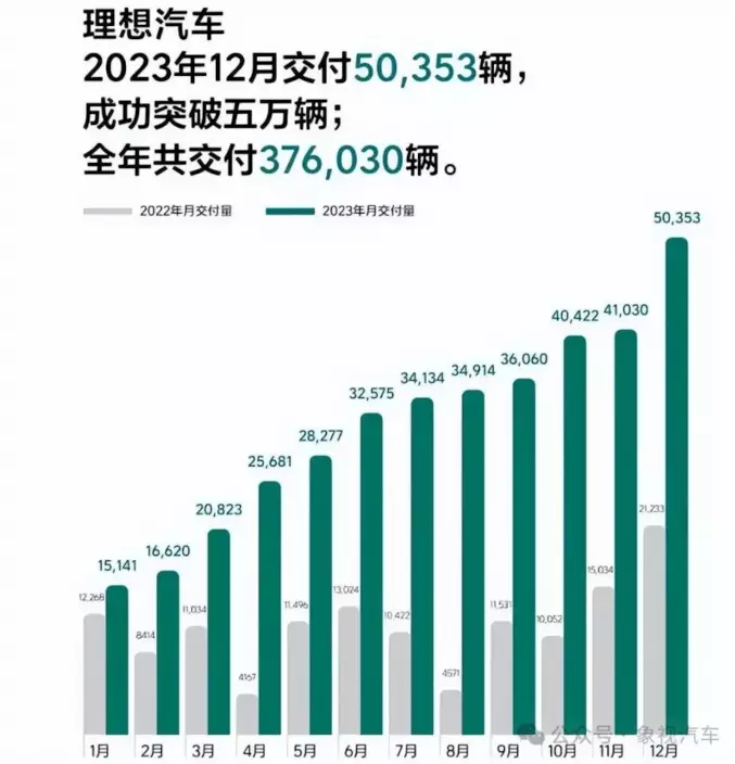隨後經過產品更新換代,李想用L7、L8、L9三款新車,才將公司拉出銷量低迷的泥潭。進入2023年,理想交付量幾乎月月創下新高,及至年底12月,交付量甚至突破了5萬輛大關。這一年,理想三款新車年交付量全都超10萬輛,整體銷量同比暴漲182.20%至37.60萬輛,以巨大領先優勢坐上新勢力頭把交椅,重構了「理蔚零」(理想汽車、蔚來汽車和零跑汽車)的市場新格局。