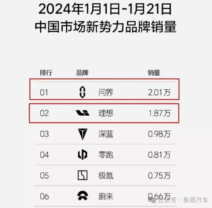 然而這份喜悅還不及大肆慶祝,理想就在今年開年遭遇華為的第二次迎頭痛擊。2024年第一周,理想只交付0.43萬輛,其新勢力銷冠寶座,被0.59萬輛的華為「問界」奪走;第二周,問界依舊力壓理想;第三周,理想才以微弱優勢奪回銷冠。但是綜合前三周,問界以2.01萬輛的成績坐穩新勢力銷冠寶座,而理想以1.87萬輛的成績滑落至第二名,其長期穩居第一的格局被打破。