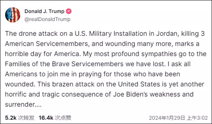 美軍在約旦一座軍事基地遭到無人機襲擊,造成 3 名美國士兵死亡,至少34人傷。預計受傷人數將繼續上升。這是新一輪以巴衝突爆發以來,首次有美軍在中東地區遇襲死亡。