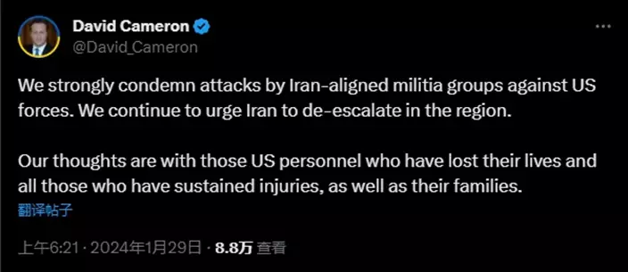 英國前首相、現任外交大臣卡梅倫在推特發布聲明,向傷亡美軍士兵及其家屬表示慰問,同時「强烈譴責與伊朗結盟的民兵組織針對美軍的襲擊」。他還繼續敦促伊朗緩和地區緊張局勢。